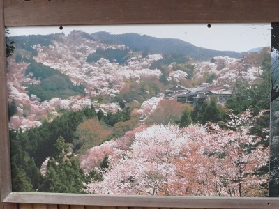 これまた、秀吉はんが狂喜乱舞して飛び跳ねた(と、確かにどこかに書いてあった)吉野の桜の絶景ポイント。右は、「春にはこうなりますよ」という親切パネル。スギアレルギーじゃない方は是非観に行ってください!(涙をふけよ……)