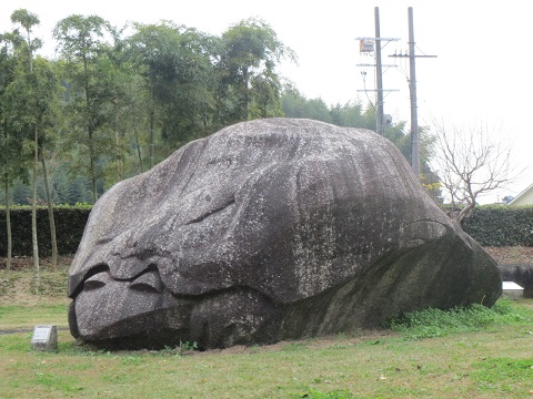 飛鳥資料館のお庭には、花崗岩で作られた飛鳥の石人像や亀石の、おそらく原寸大複製がボンボン置かれていて、まるでどこかの近代アート美術館に迷い込んだようなv
