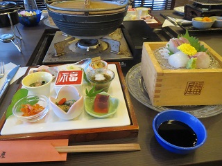 そして特筆すべきはご飯のすばらしさ。これは夕食のオードブル段階の写真ですが、お宿の夕飯って多過ぎたりすることも多い中、ここのは交響曲のようにある意味計算されたかのような一連の流れにただ身をゆだねるかの如く、出るわ出るわの山海の幸の織りなすハーモニー、あるいは変奏曲のように差し出されるデザートすらもがやめられない止まらない……!