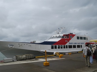 波の高さ1.5メートルの中を、高速フェリーあいびすは25ノット(約時速46キロ)でぶっとばし、佐渡まで約65分で到達します。予想より揺れたなと。大丈夫、乗り物は酔わないんだ。