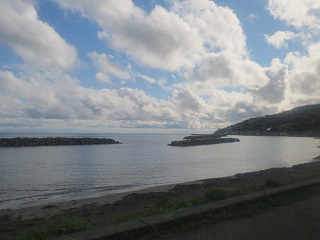 バスガイドさん曰く、佐渡はS字型にも見立てられるそうです。で、これはS字の下のカーブの海岸線を時計回りに進んで行ってるところでございます。右の写真は、真野湾。奥で、海岸線が深く湾曲しているのが見えますでしょうか。見るからに良港。