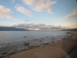 船窓から見えました、佐渡の遠景でございます。見よ、島の上空にはなんと青空が!