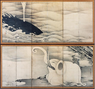 ポスターの渋さからお分かりかもしれませんが、これは若冲の水墨画をメインにした通好みの展覧会でした。当時は本命(「動植綵絵」)を観る前に番外編を見にいくような気分でありましたが、行ってがらりと印象が変わったので今はこの順番で良かったのではないかと思っています。カラフルな色彩の魔術師としての若冲もさることながら、モノトーンの世界で躍動する超絶的な筆さばきはダイレクトに胸に響くようで、さらに魅せられてしまったとでもいいましょうか。例の「象と鯨」に会えたのもこの時が最初です!