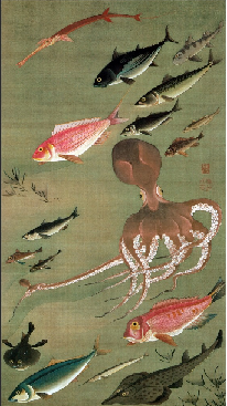 !? タコ?! これだけだと意味がわかりません! あの超絶技巧な鳳凰を描いていた絵師がなにゆえにタコを?! 幼少のみぎりよりタコもクジラと同じぐらい好きだった私はたちまちそのギャップに胸を撃ち抜かれます……(カオス) ようやくこれが全三十幅からなる「動植綵絵」というシリーズの一枚であることを知ります。