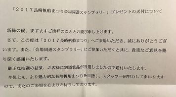 というわけで、先月行った長崎帆船祭りで何気なく書いて出してきたスタンプラリー兼アンケートの景品が当選したらしいっす! 中華菓子5点セットv たぶん一等とかではないけど(笑)嬉しい! 甘味の山じゃ……!