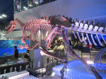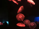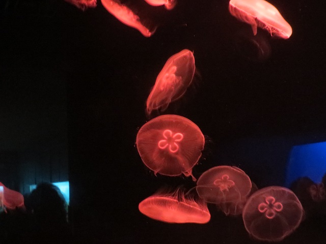 何だか、スタンリー・キューブリック映画の一場面のようだw 入口付近で早くも圧巻の様相を見せます、クラゲの大水槽です。いろんな色のランプがつくのですがなぜか赤ランプの時に撮ったらこんなことに……。この水族館はクラゲとペンギンに力を入れている模様です☆