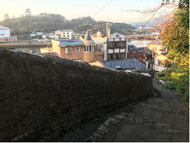 左が、そのホテルへ向かう石の坂道。オランダ商館時代に築かれたオランダ塀! こういった壁で外国人と日本人の居住地を分けていたそうです。これを眺めながら歩けたのは良かったです。この先はジャングルいえ森の小路に繋がっていました。クモがいっぱい巣を貼っていました。クモの糸に何度か絡まってヒィィッと叫びました。これ以上は言いますまい。ワタシはともかくこれから行かれる方には謹んで送迎車召喚をオススメ致します。
