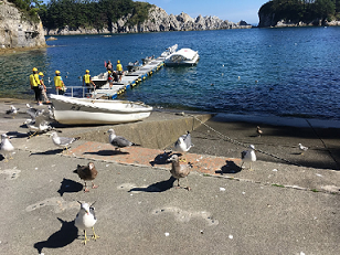 海を走るサッパ船。まあ、カモメたちが(エビせんを狙って)まるで私たちを請い慕うようにじゃれてくるので楽しいわ!!